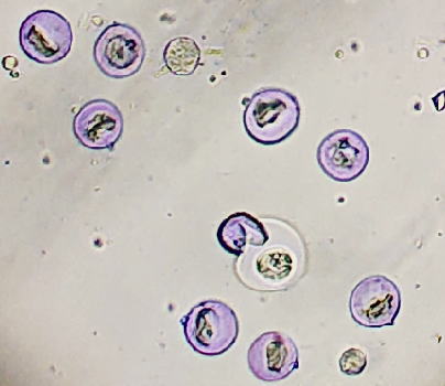 真ん中の花粉は殻が割れて中の精子が出てきています。スギ花粉は湿度があると(水に触れると)殻が割れます。したがって、濡れた洗濯物に着くと、精子が飛び出て洗濯ものに着くため服は精子でべたべたになります。