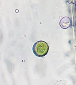 真ん中の緑の丸いものがスギナ胞子。右上はスギ花粉。